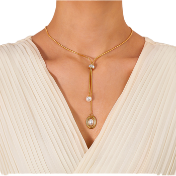Neueste Modelle Damen 18K Vergoldete Verstellbare Zirkon Mode Edelstahl Oval Perlen-Anhänger Halskette